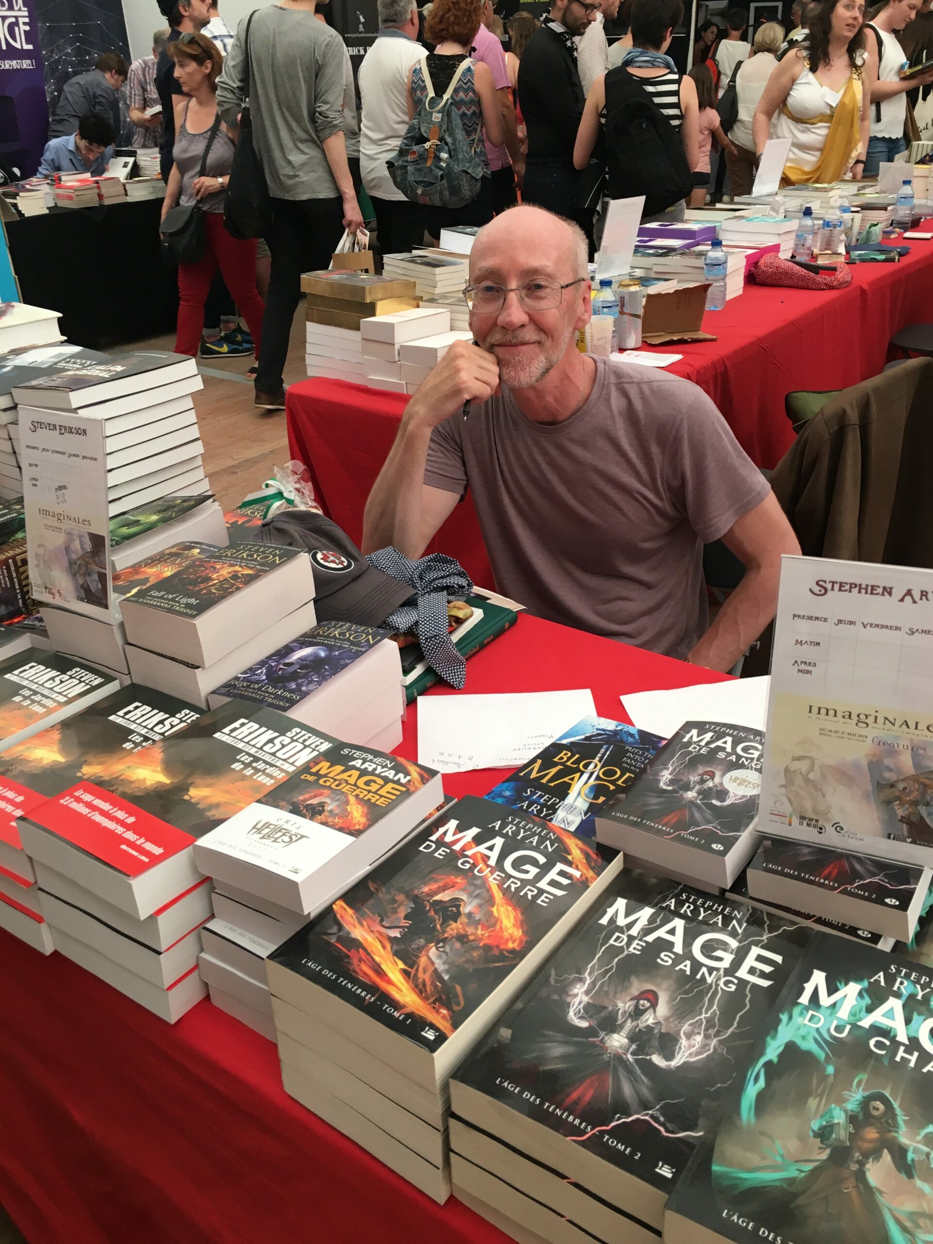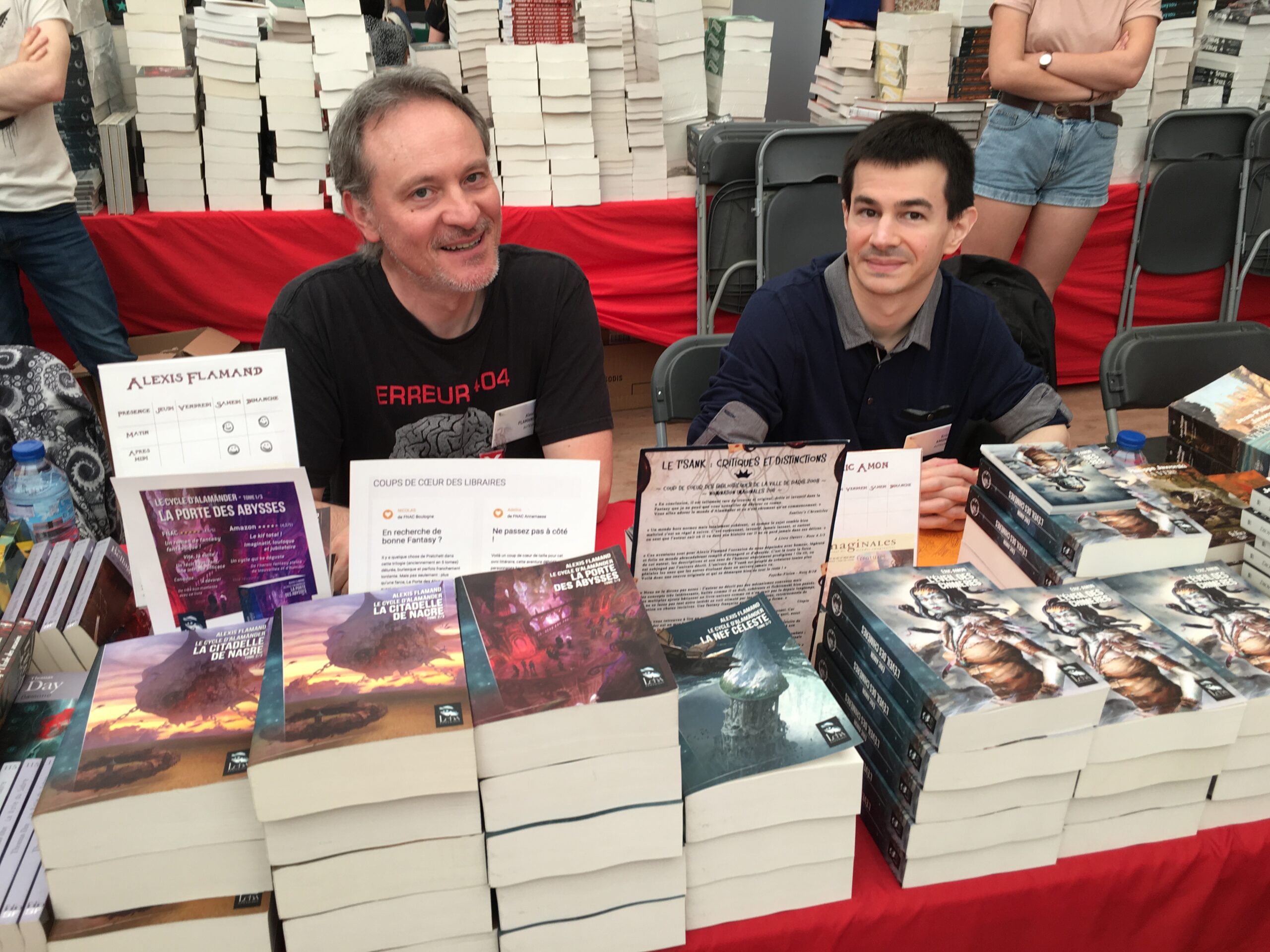 Outre Steven Erikson, auteur de la saga de fantasy au succès mondial « Le livre des Martyrs » dont le premier tome « Les Jardins de la Lune » venait juste de paraître et qui était un des invités d’honneur de cette 17ème édition des Imaginales, Leha comptait donc deux autres auteurs invités : Alexis Flamand qui venait d’achever sa trilogie du Cycle d’Alamänder et Eric Amon, auteur de l’Éveil des Chimères.